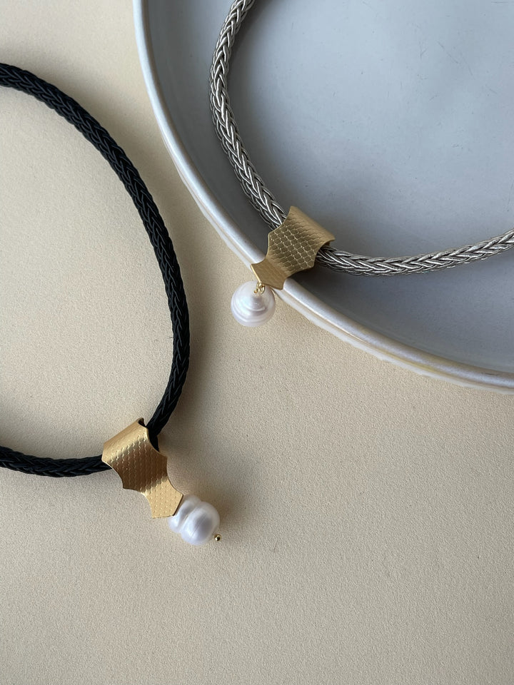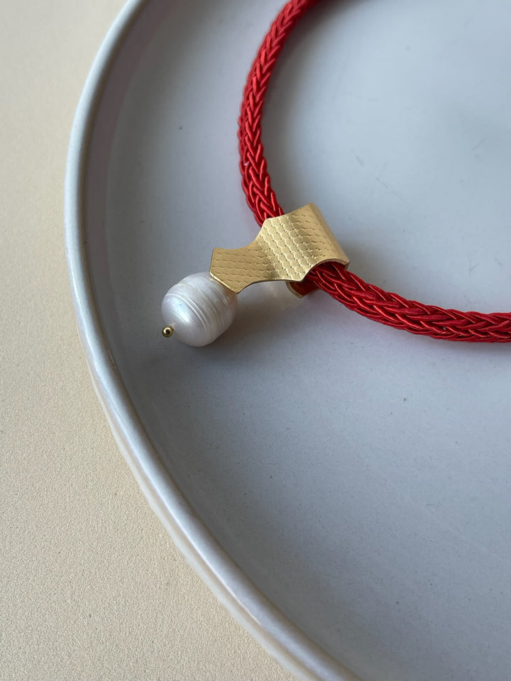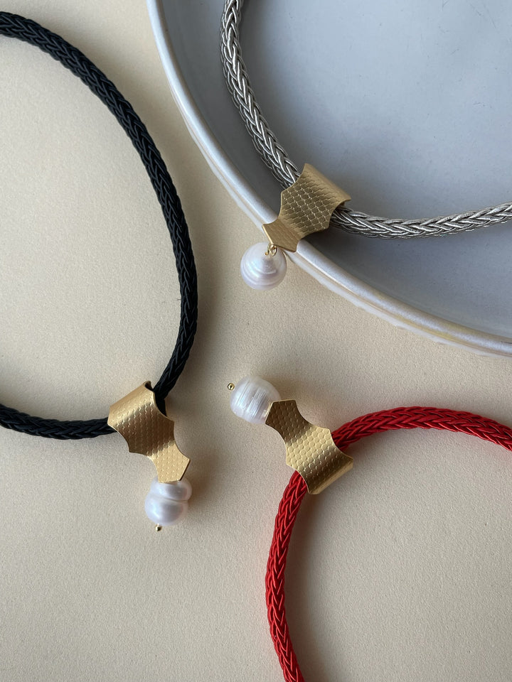 Su diseño combina un cordón tejido —en tonos rojo, negro o gris— con un dije dorado martillado en bronce con baño de oro del que nace una perla natural, símbolo de pureza, renacimiento y evolución.